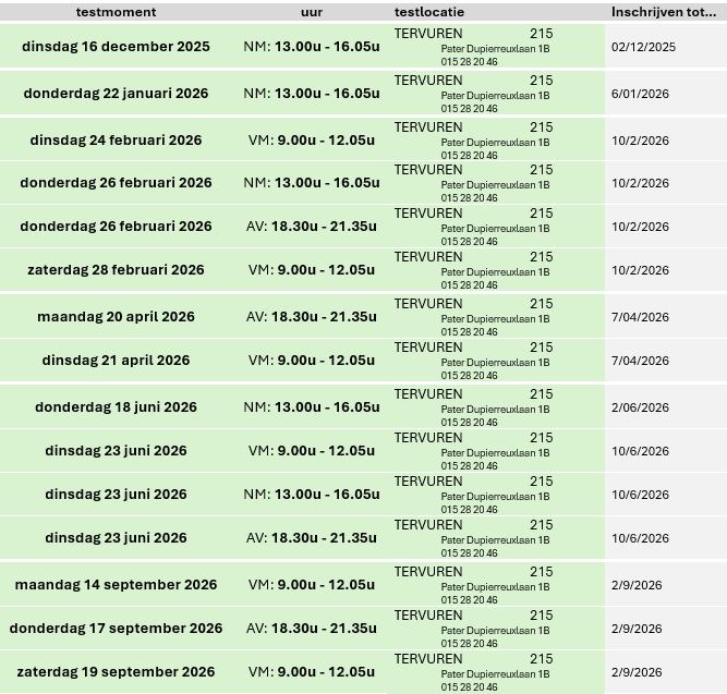 Inschrijven voor een testmoment en locatie naar keuze kan je doen op één van onze secretariaten. Hier krijg je ook informatie over de beschikbare plaatsen.